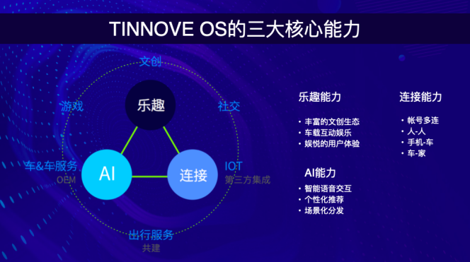 据贺刚介绍,腾讯作为梧桐车联的控股股东,TINNOVE OS可也说是享受到了腾讯独家优势资源和服务生态,其通过将腾讯车联的基础能力和腾讯核心生态资源深度整合,构建了乐趣、连接、AI三大核心能力。